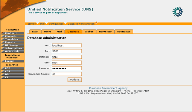 In order for any changes to take effect the user must select the âUpdateâ button. If the operation is successful, the appropriate information message will be displayed. However, if any of the new settings are not valid (wrong address of database/port, wrong username/password) the application will not allow the configuration update and will return the appropriate error message.